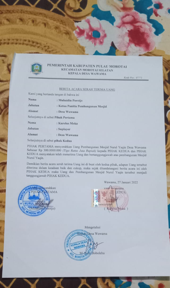 Sementara itu, suplier material bangunan, Karous Moka alias Risky, saat ditemui di kediamannya di Desa Wawama, membenarkan bahwa dirinya menerima dana sebesar Rp300 juta tanpa disertai dokumen RAB dari panitia.